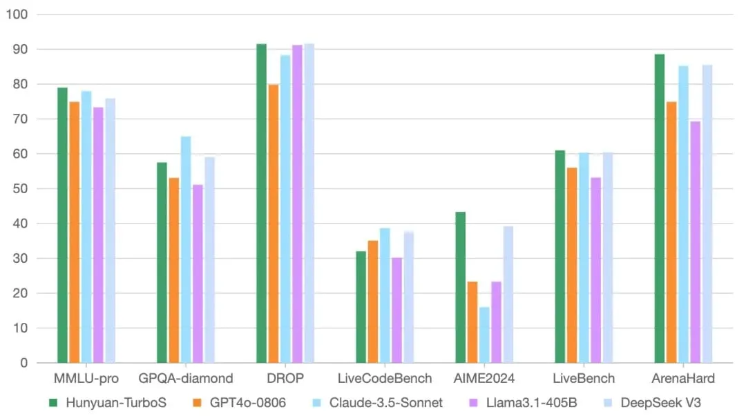 性能基准显示在各种测试中的Hunyuan Turbo的匹配或超过顶级模型。它在MMLU上得分为89.5,略高于OpenAI的GPT-4O,并在数学推理基准数学和AIME2024中获得了最高得分。对于汉语任务,它在中文simpleqa上达到了70.8,表现优于DeepSeek的68.0。但是,它在某些领域落后于SimpleQA和LiveCodebench,其中GPT-4O和Claude 3.5的表现更好。