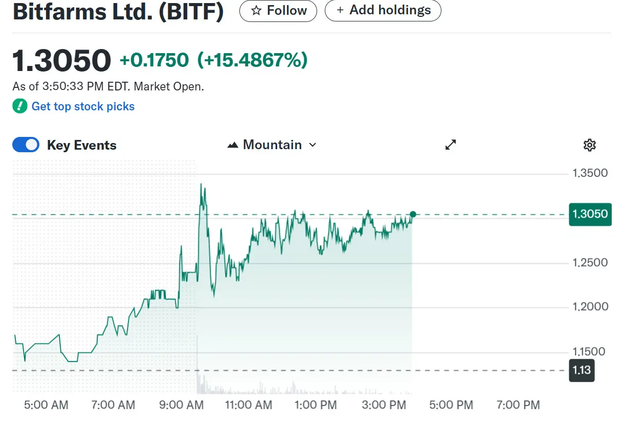 在公告发布时,Bitfarms据雅虎财经数据显示,该公司股价上涨约15.48%,至1.30美元。该公司市值目前接近7.29亿美元。