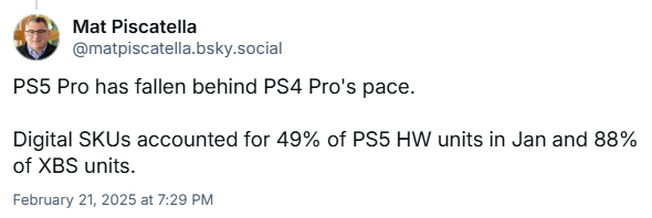 Mat Piscatella没有为PlayStation 5 Pro的销售提供更多数字。但是,它的高价和整体降低游戏行业的销售可能是PS5 Pro无法在销售方面赶上PS4的主要原因。