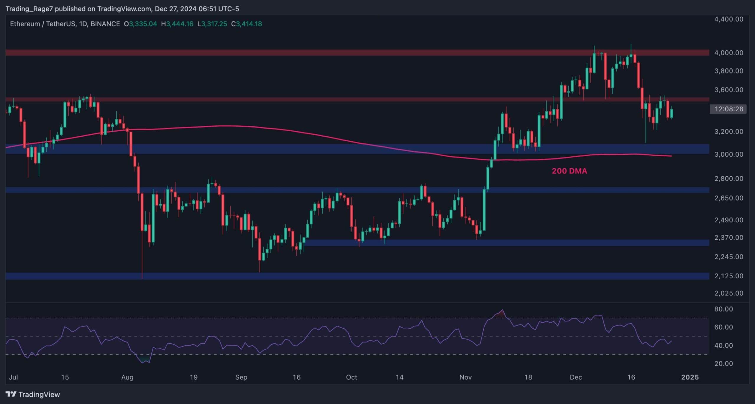 日线图显示,以太坊的价格在4000美元的阻力位形成了明显的双顶模式,同时两次被拒绝。3500美元的水平也被跌破,市场在多次尝试失败后未能收回。