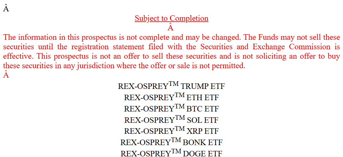 但如果这还不够,Osprey Funds 和 Rex Shares 已经提交与 SEC 合作的七个独立 ETF,包括 DOGE ETF、邦克 ETF 和 TRUMP memecoin ETF。