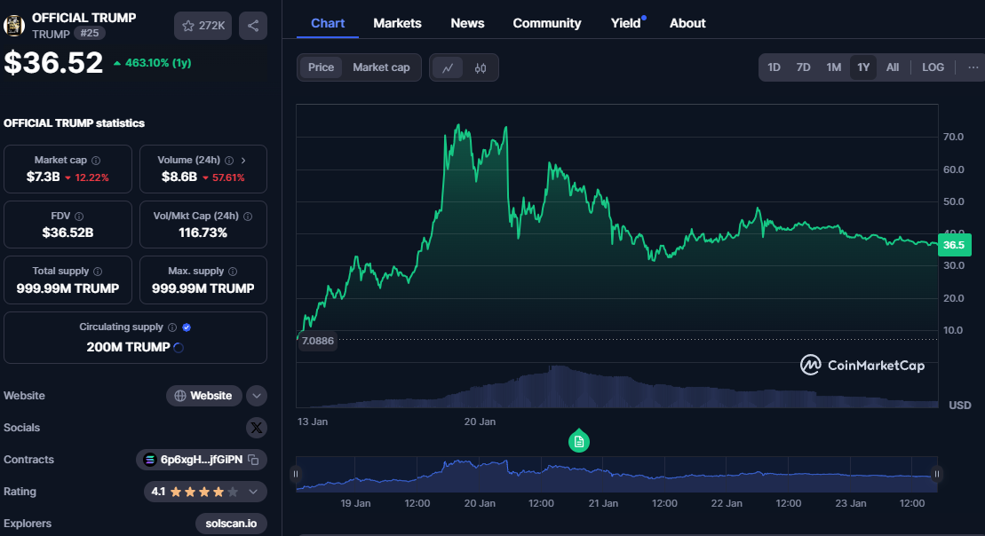 按市值计算,$TRUMP 现在是第 25 大代币,截至撰写本文时,其交易价格约为 37 美元,约为特朗普就职前夕创下的历史高点的一半。