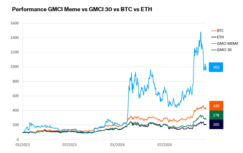 然而,尽管听起来很可笑,但它们的价值却不容忽视。这GMCI 模因追踪器显示,去年一篮子 28 种模因币的表现大幅优于比特币和以太坊。