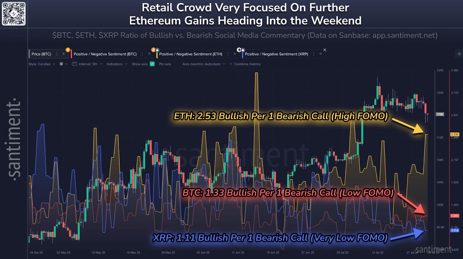 以太坊更容易受到逆转的影响,而 BTC 和 XRP 较低的热情水平可能为上行价格加速创造空间。