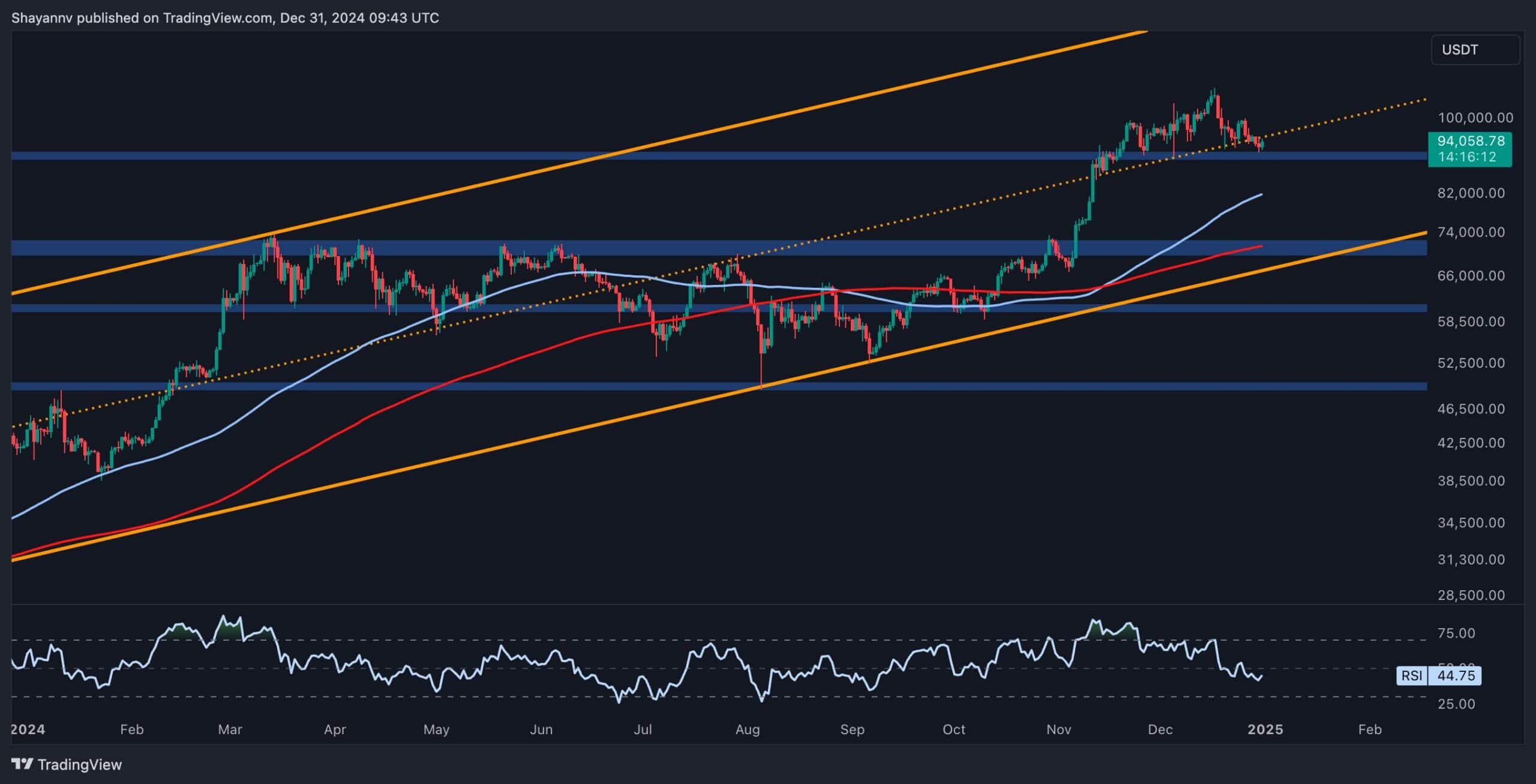 比特币最近经历了一次显著的回调,价格目前稳定在9.2万美元附近的上升通道中间趋势线。这一水平是一个关键的支撑区,历史上代表了一个重要的需求领域。尽管有这种支持,卖家仍施加了相当大的压力,有可能突破这一关键门槛。
