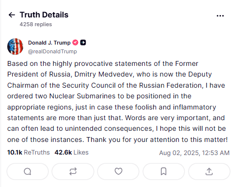 : 据报道,美国总统唐纳德·特朗普下令美国核潜艇在前俄罗斯总统德米特里·梅德韦杰夫拒绝特朗普为期 10 天的结束乌克兰冲突的要求后,特朗普被调往新职位。