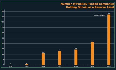 这一激增使总数达到 141 家公司。到 2025 年底,预计至少还会有 36 家公司加入比特币他们的资产负债表。这意味着比现在的数字增长了25%。