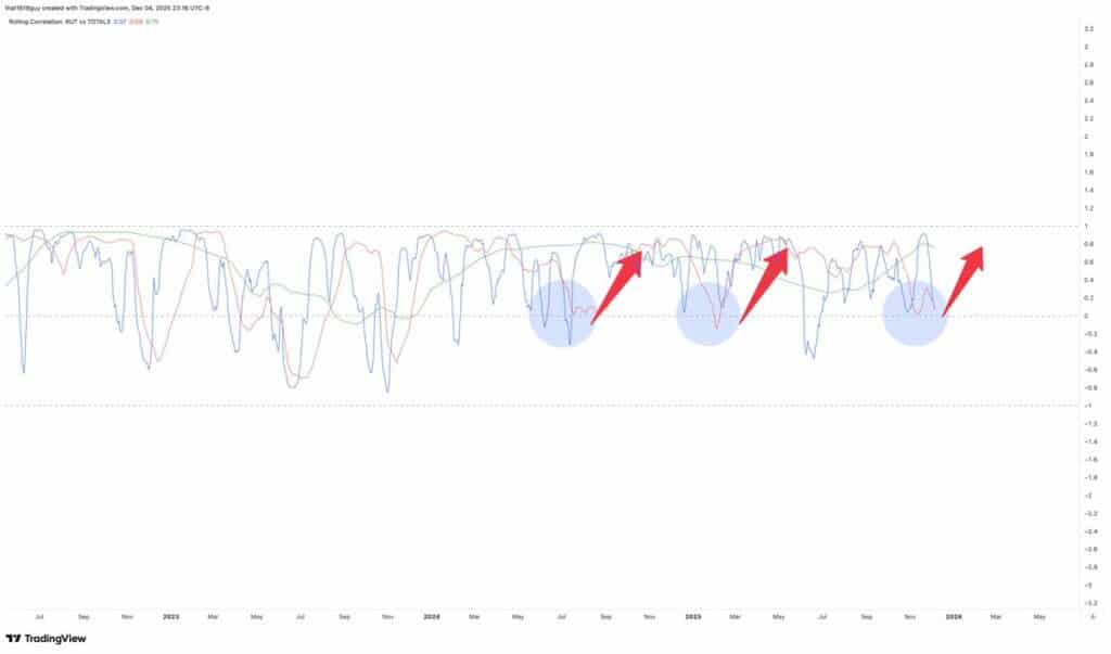 如果宏观经济环境保持支撑,且罗素2000指数维持突破,那么这种格局可能再次有利于山寨币。相关性分析表明,一旦短期波动趋于稳定,Total 3可能会效仿小盘股的强势上涨趋势。