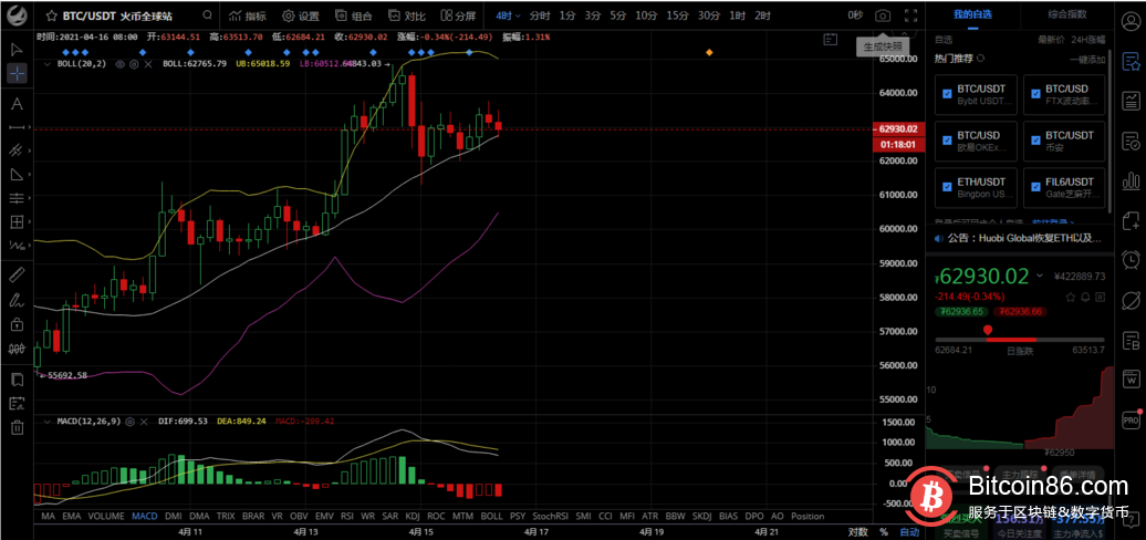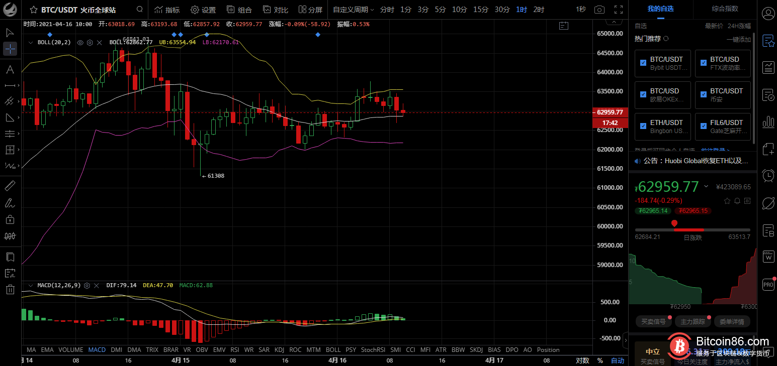昨日比特币早间一波先行下跌,后面开始小幅反弹,随后陷入震荡,一直在63300~62200区间不断来回,整体节奏上多空来回博弈,中间不间断,随后在昨日晚间一波拉升过后,币价整体震荡区间有所提高,凌晨3点一波拉升,今日早间一波回落,还是在此区间,整体趋势上依旧处于震荡,此区间不破多头难上行,一旦破位将再次上冲,近期看好高点破位!
