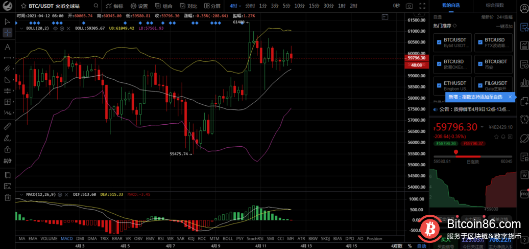 技术面1小时图中,布林带开始缩口,行情在中轨附近运行,随着口袋缩窄,震荡区间越来越小,整体短节奏盘面观察,有一种空头笼罩的感觉,日内多头思路需要逐渐转换,附图指标MACD双线在零轴上方,逐步形成死叉,行情有开始转空节奏,目前多空转换过程中见,多头6万依旧蓄力不够,反观空头走势还是较为强势,短节奏上可以高位做空!
