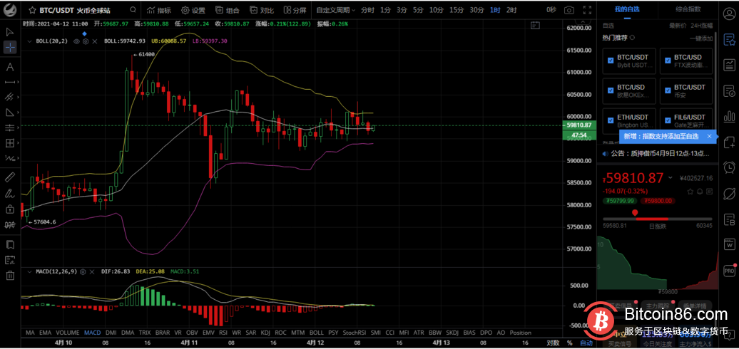 昨日早间比特币一路下跌,在58369附近止跌形成反弹,最高触及60669,随后冲高回落,行情在60200~59200区间震荡,今日早间行情依旧在区间震荡!