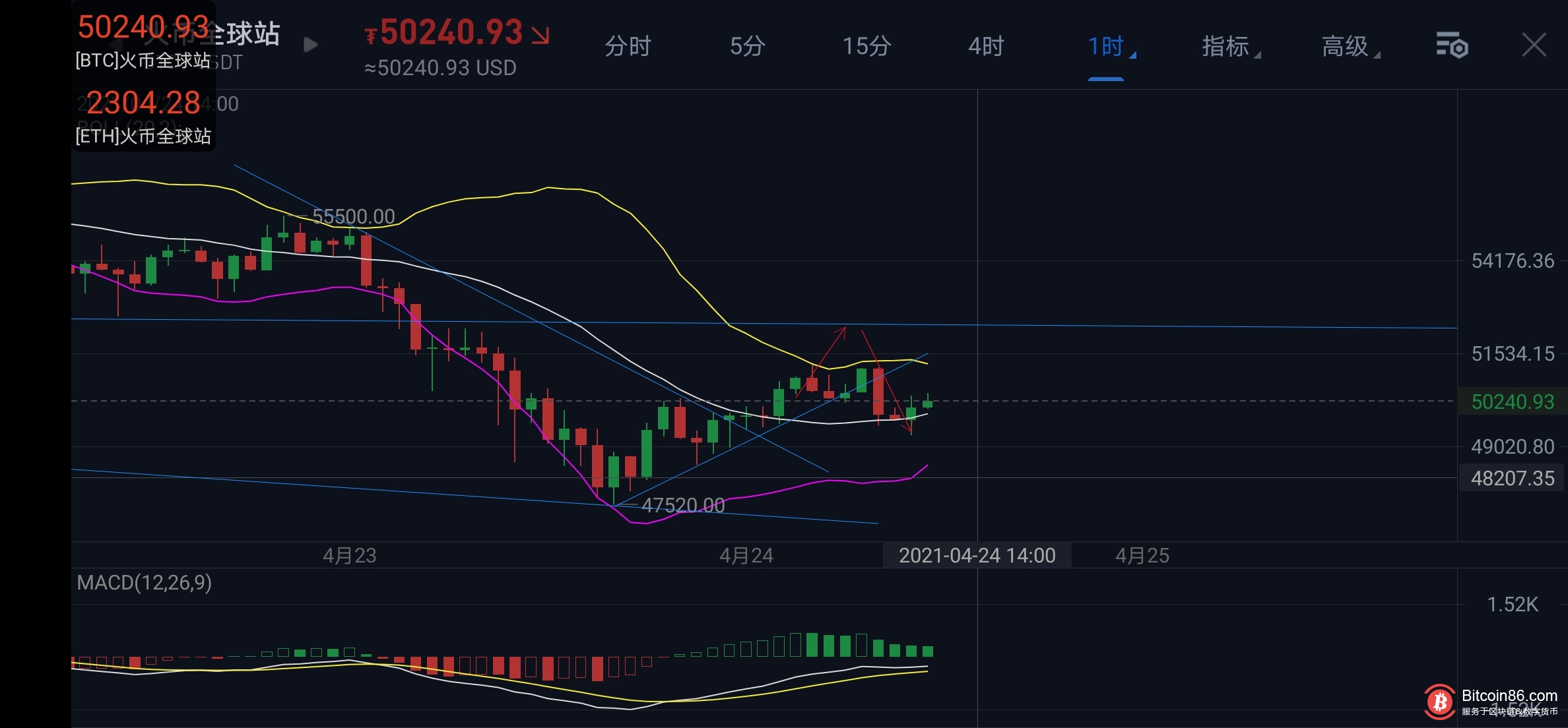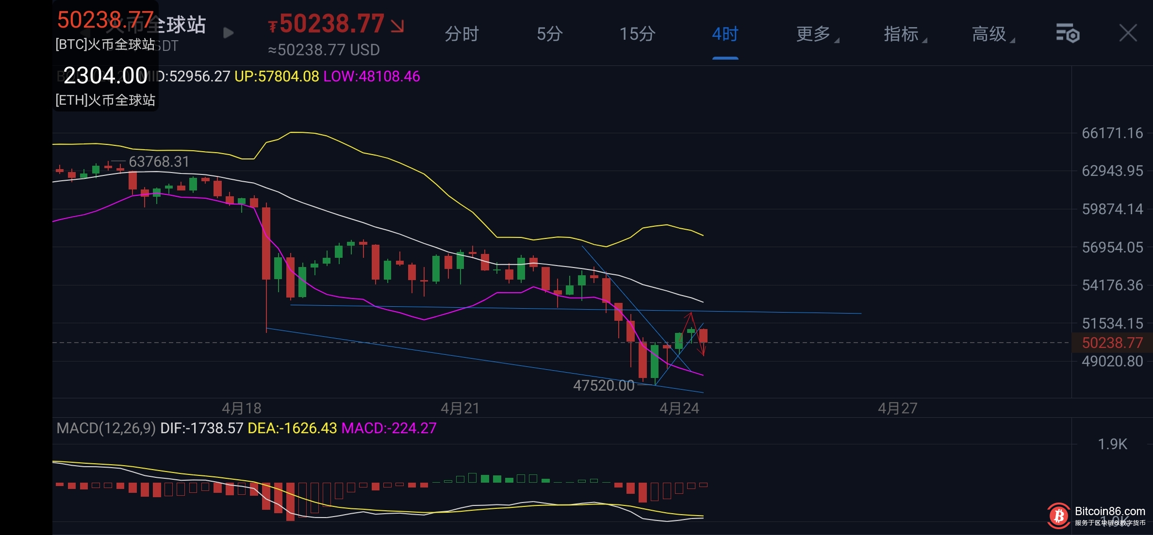 比特币昨日一路下跌,在下方探底47520后开启反弹,随后在高点51200上方一点止住涨势,有回调的趋势,日内一样依托上方高点布局空单!