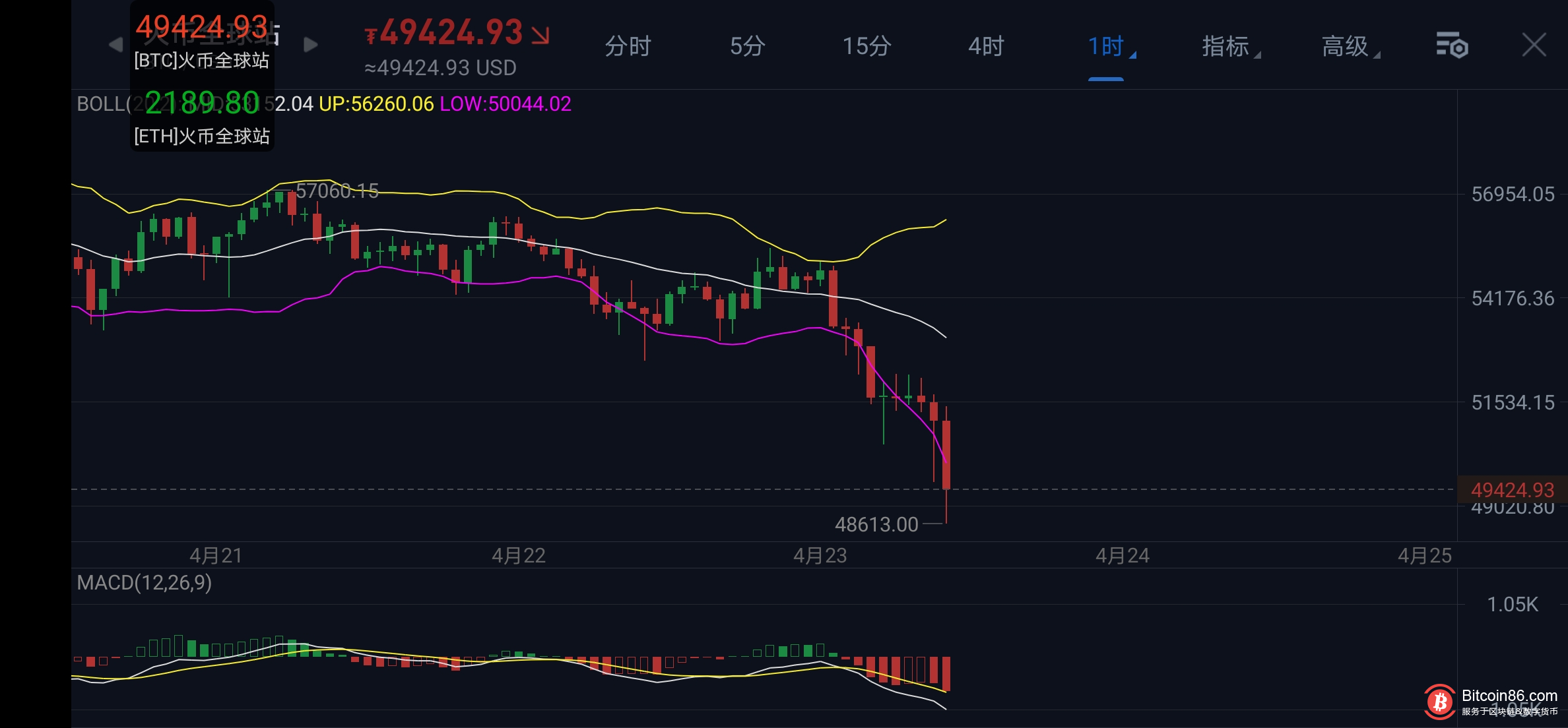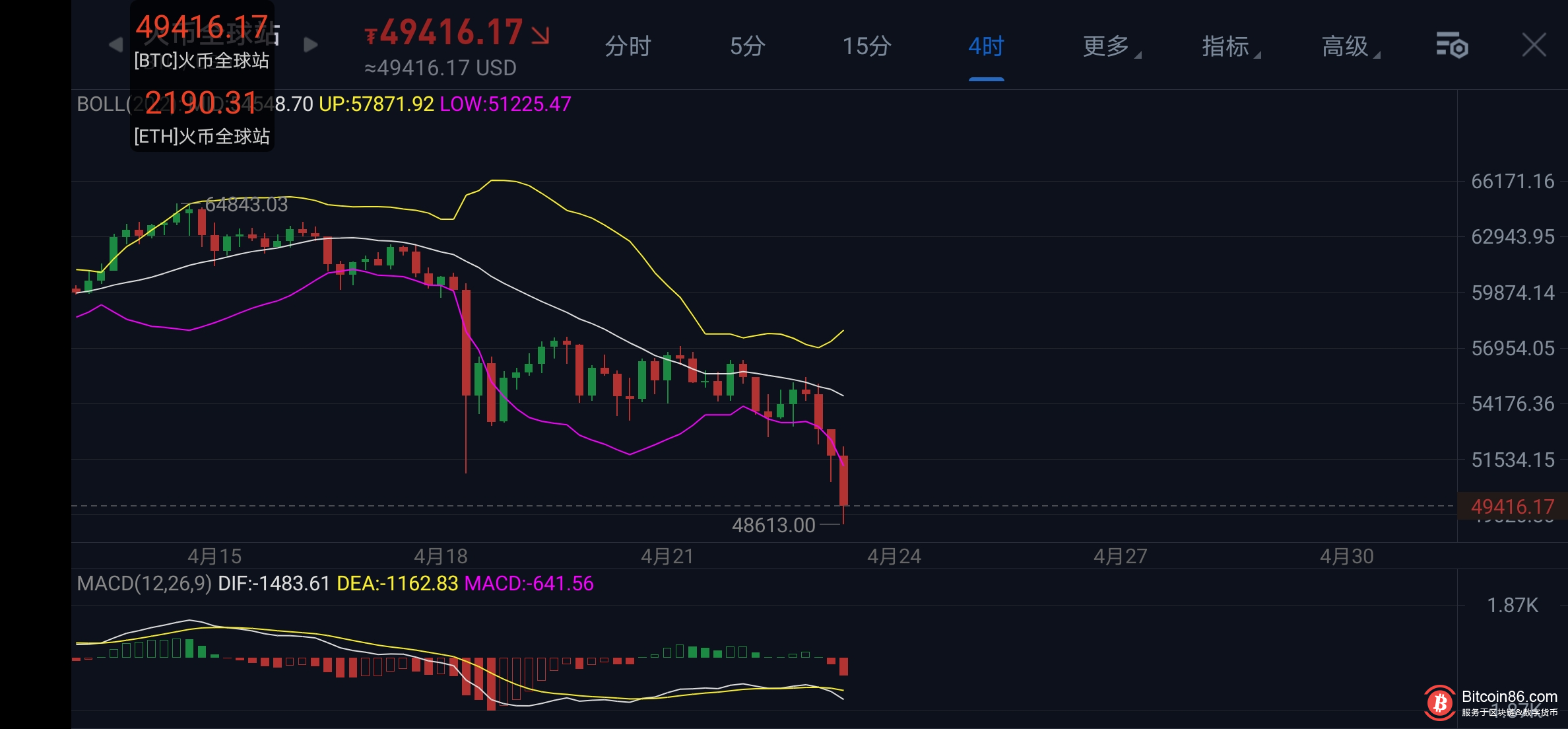 比特币4小时图中,布林带开口向下,行情已经跌破下轨,整体盘面走势极弱,连阴延续,附图指标MACD双线在零轴下方形成死叉,空头能量柱开始放量,由此可见走势上以空头为主!