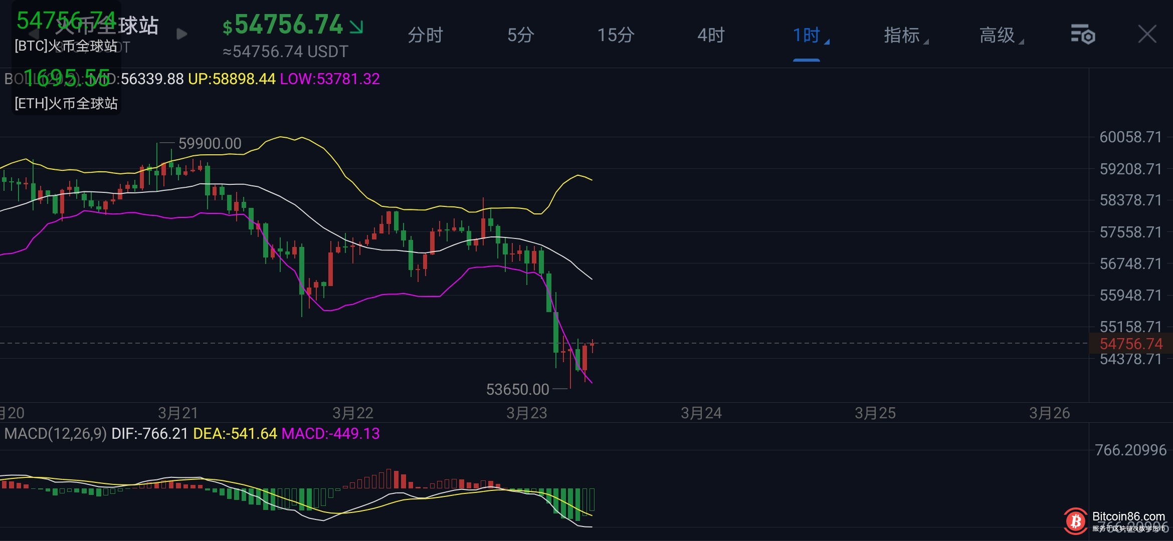 比特币日线图中观察,币价日内已经跌破中轨支撑,若能延续,多头情况十分不乐观,届时中轨支撑转变为测压,日内我是看好跌破中轨,附图指标MACD死叉才刚刚开始,空头能量柱才出现第三根,释放远远不够,后续走势看空无疑,对于下方先看到前期低点53000,破位继续下看,不能破位在来调整!