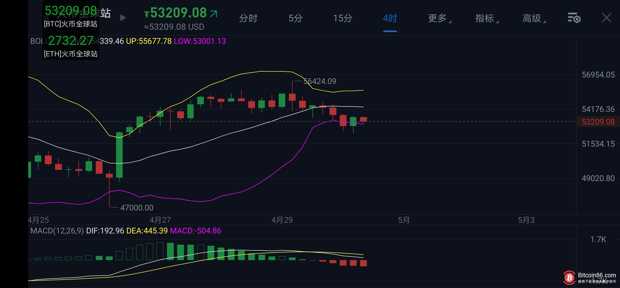 比特币4小时图中,布林带缩口,行情在中下轨区域,多次跌破下轨,在底部形成支撑,不过行情一样是围绕着下轨在运行,随着口袋开口,下轨向下,行情一样会走下跌路线,附图指标MACD双线在零轴上方,死叉向下,空头能量柱处于放量状态,整体走势上个人看好高空下行!