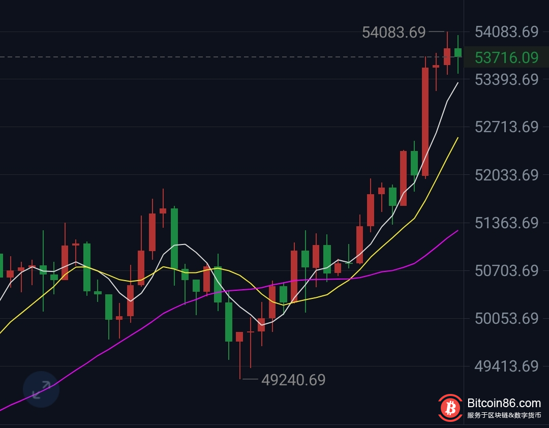 昨日比特币盘面整体维持调整状态,低位回踩49200关键支撑后走出强势反弹,后续突破51800压制点,目前高位如期逼近54000附近,币价若能进一步向上突破,价格有望触及前期小压制58000附近,多头上行趋势不容小觑!