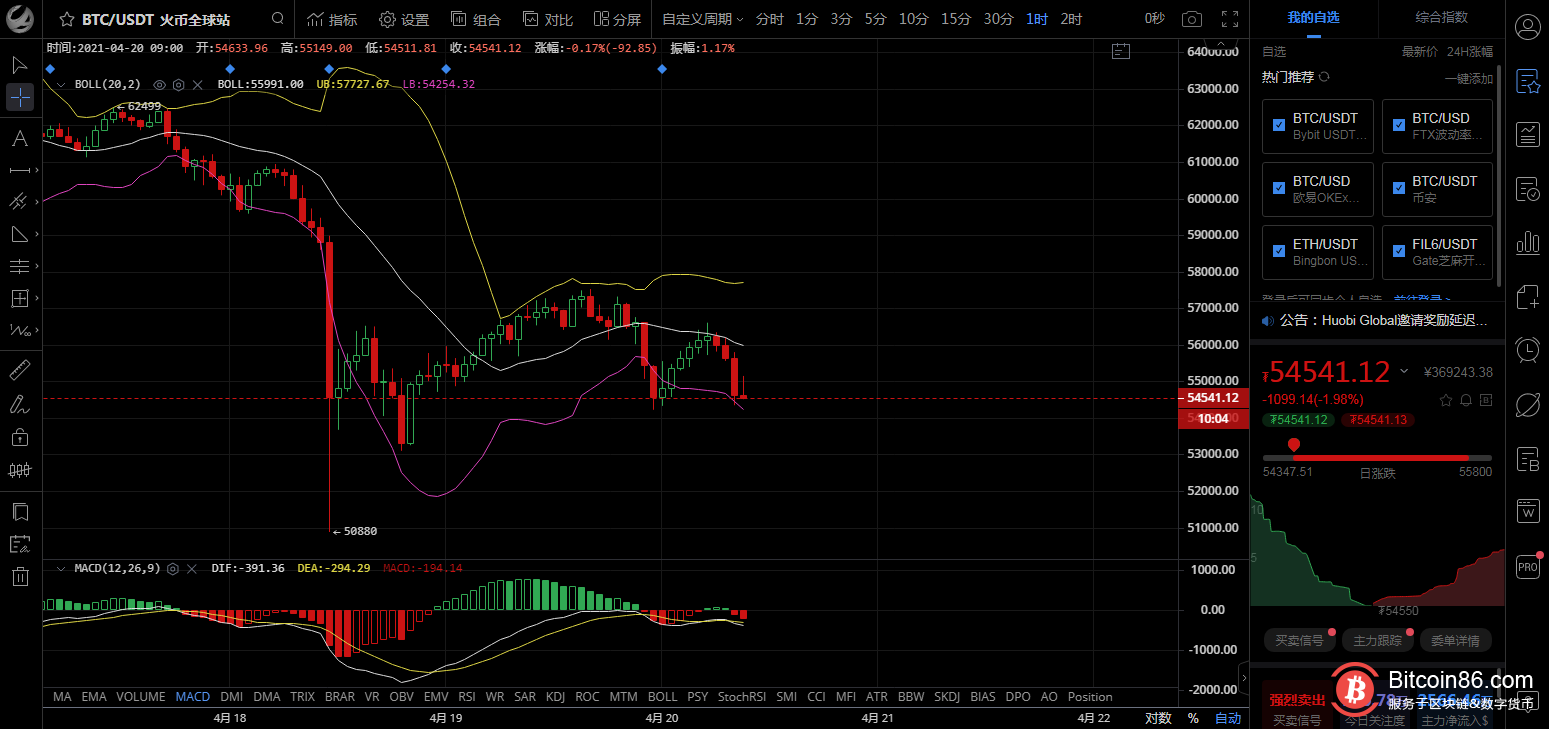 技术面1小时图中观察,布林带开口向下,行情在中下轨区域运行,昨日连阳触摸中轨,开启大跌,说明中轨位置测压明显,上方56500压力较大,多头想上行,一时之间较为困难,附图指标MACD双线在零轴下方,形成死叉向下运行,空头能量柱开始逐步变大,后续走势明显,空头为主!