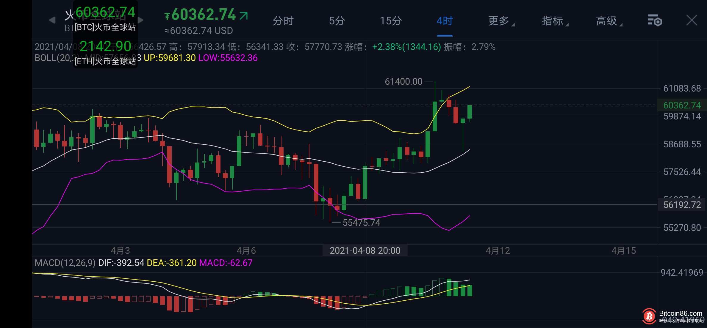 比特币昨日探高回落,未能站稳60000,一波诱多,属实反转厉害,单边多头难以延续,但整体节奏上依旧处于震荡上行,支撑是有所提高,日内多头趋势依旧存在,站稳6万大有可能!