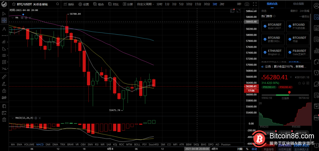 大饼当前属于反弹遇阻后的震荡,而从1小时走势上看,比特币均线下方交叉向上,但币价一直在均线附近运行,随时会有跌破均线且开始走低的迹象,而且反弹高点在不断降低,可见有进一步回调的可能!当前的支撑还是凌晨回踩低点55400位置,不破位的情况下将会在56000~56500区间内震荡!如果行情破位,则必然下探55400支撑一线!