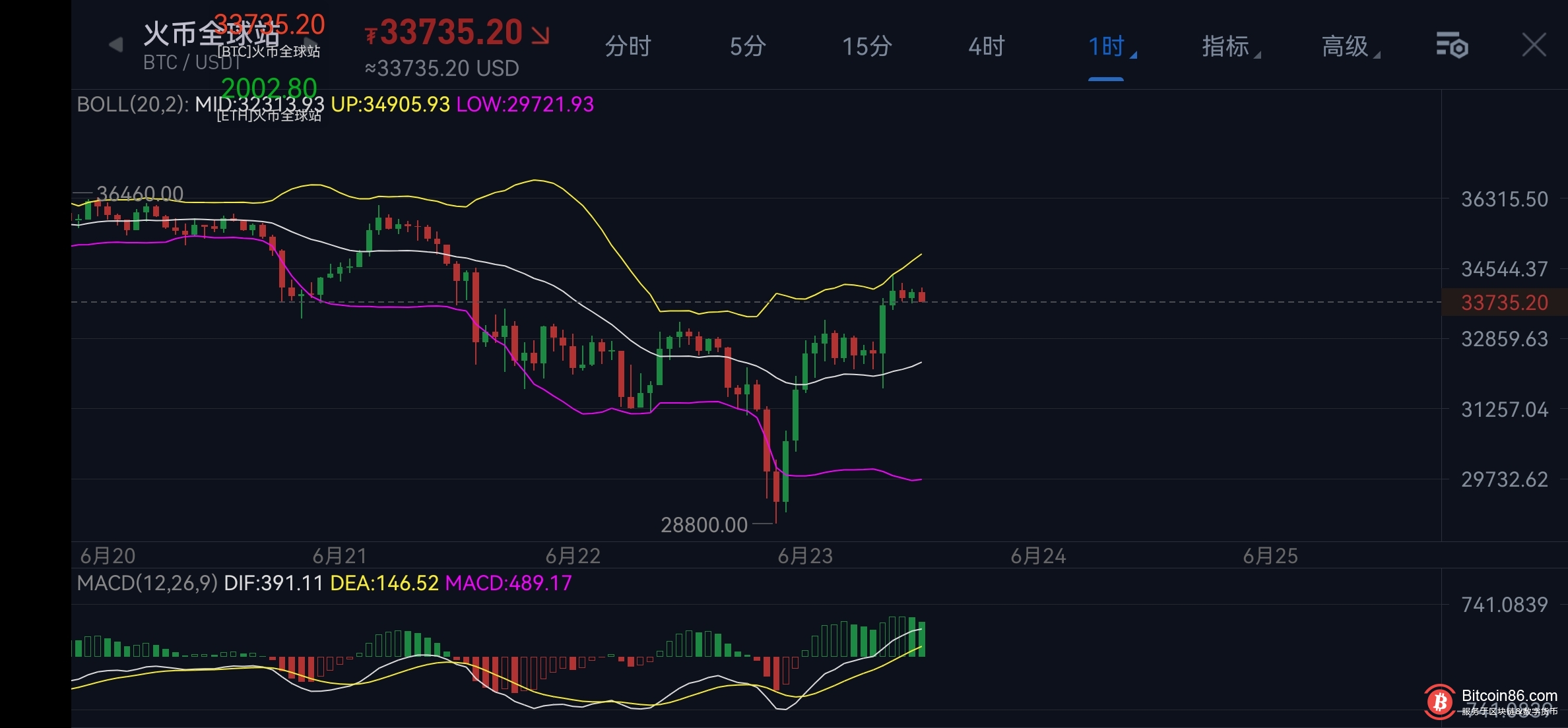 比特币昨日先行下跌,跌破30000,最低到达28800,随后再低位发起反弹,多头一路拉伸,币价到达34000,早间在此位发起振荡,昨日空头思路得到验证,日内将再次转换思路看多为主!