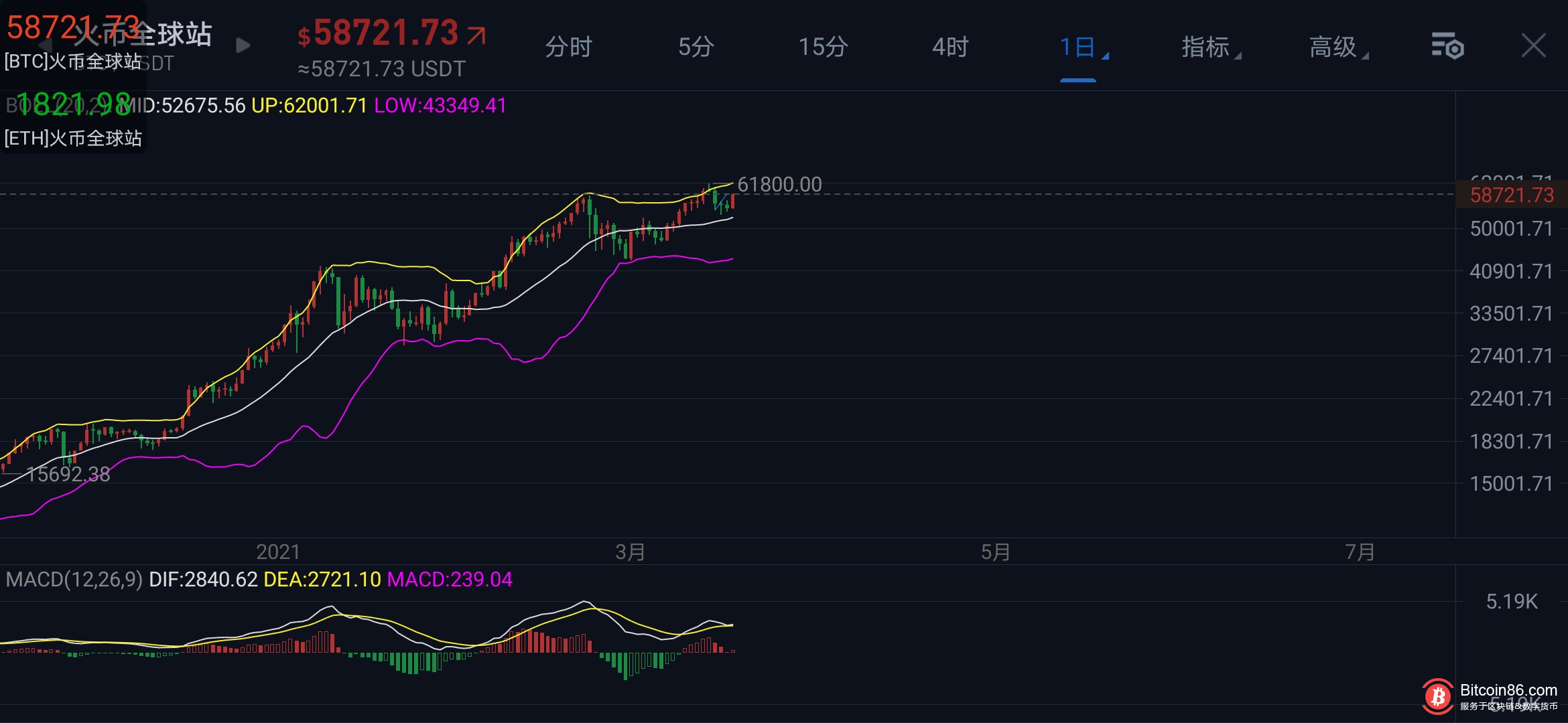 技术面看昨日价格整体走势走出下行结构,昨日的下跌也算是在预期内,没有太大意外,相反凌晨这波上探的力度来说,还是比较大的。日线上来看币价处于上行通道当中,既然已经稳定在中上轨区域,日线结构上有上行需求,可以看出比特币上次冲击6万成功过后,已经发生了回调,MA指标中三均线走势均向上运行,币价且稳企在其上方,MACD指标中双线在零轴上方预形成金叉形态,可见后续走势看多为主。