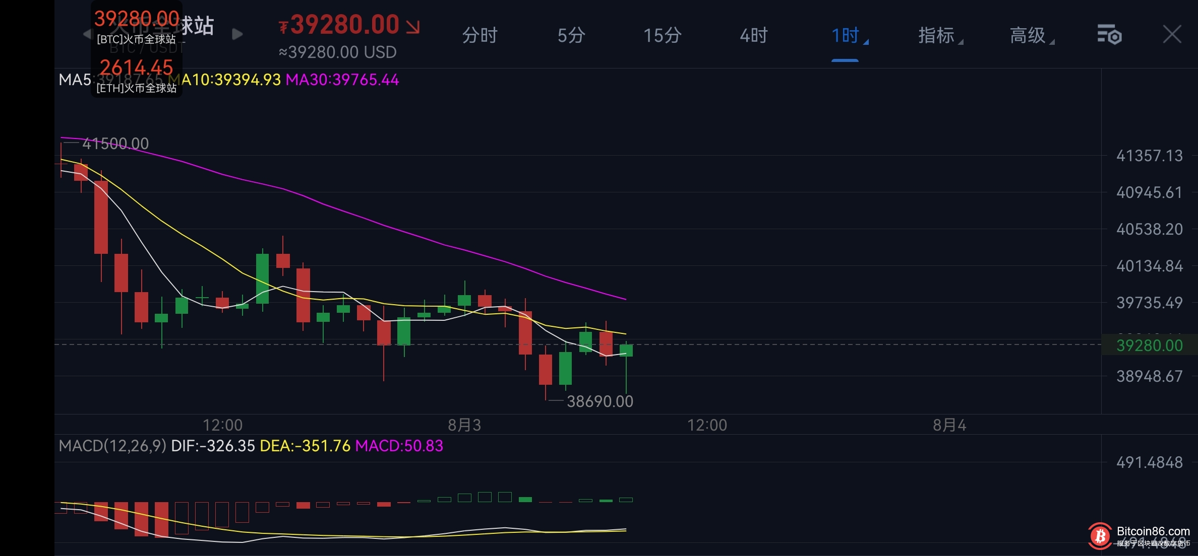 比特币日线级别构建双顶结构,当前都延续下跌,当前行情反弹,是对此前下跌的修正,也是我们短多的理由,而高空仍是我们的主要操作!上方的压力分别是昨日久跌不下的重要位置,高点39500,以及上方小时图均线39300压力位置,靠近此区域后还是干空!