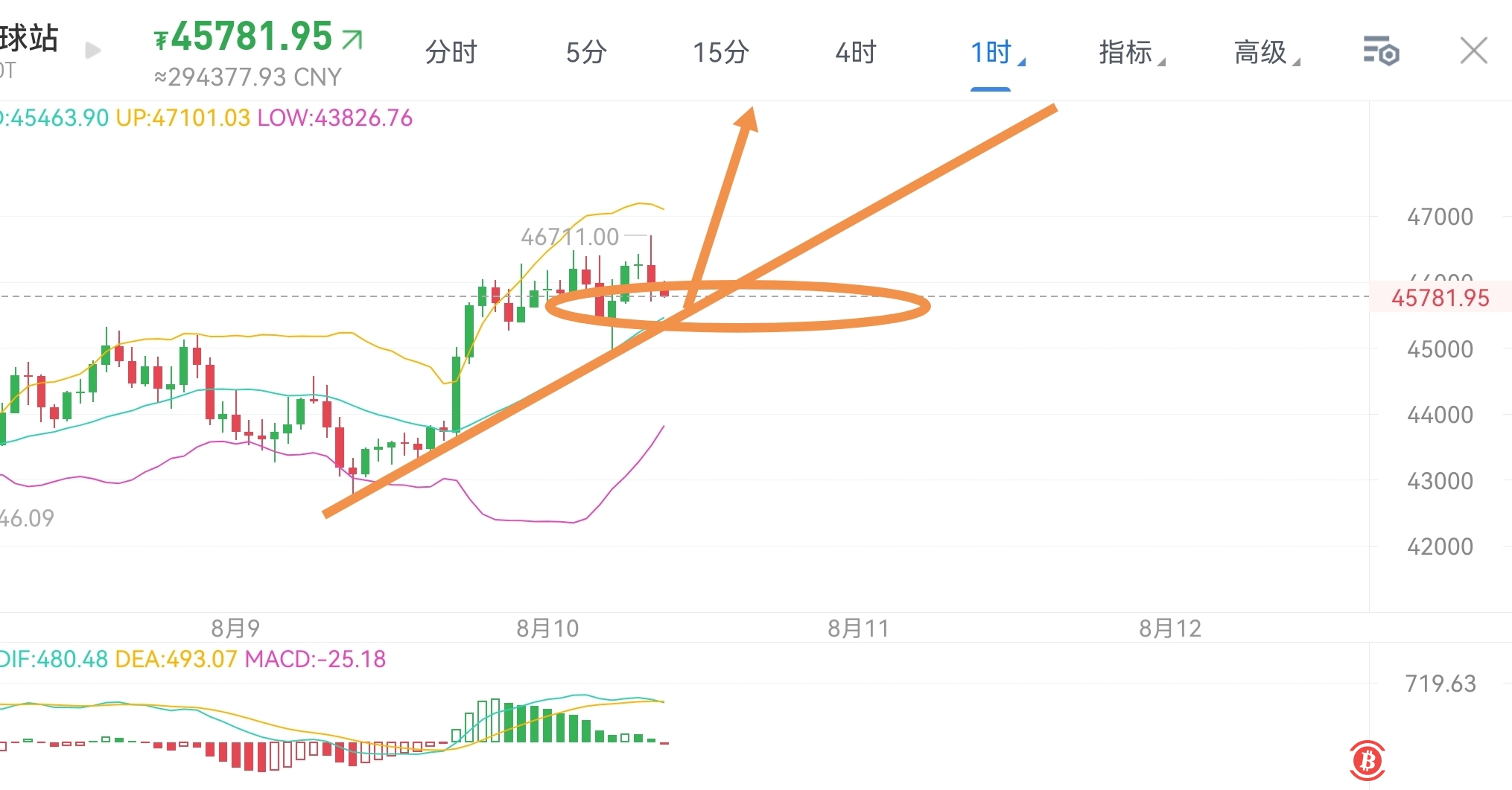 比特币今日早间探底回升,维持震荡,下方45000支撑明显,而上方高点46700则为测压,目前45000是多空分水岭,早间回踩此位后快速拉起,突破后行情转多,目前来看行情将会再次上攻高点46700区域!甚至突破,早间回落依托45000干多了!